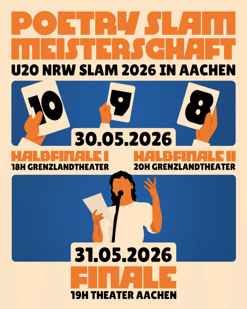 Am 30. & 31. Mai 2026 treibt es die besten Nachwuchs-Poet*innen aus ganz NRW nach Aachen. Insgesamt gehen 16 Teilnehmende aufgeteilt auf zwei Halbfinals im Grenzlandtheater an den Start. Aus diesen Vorentscheiden qualifizieren sich die besten 8 Auftretenden für das große Finale im Theater Aachen. Über ein Jahr haben sie sich mit ihrer Poesie durch zahlreiche Wettbewerbe gekämpft, um bei den Landesmeisterschaften im U20-Bereich nach der Krone zu greifen.
